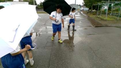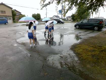 理科では、雨水のゆくえについて学習をしています。今日は、雨が降ったときの地面の様子を見ました。水たまりや水が流れているところを確かめました。