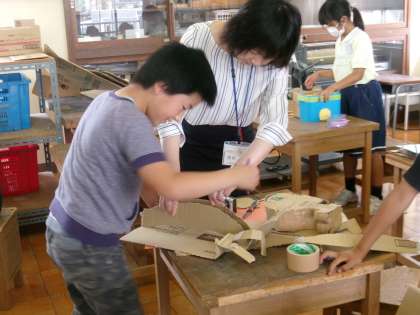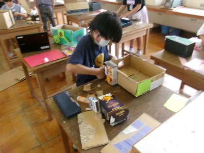 おもしろだんボールボックスを作っています。校長先生に手伝ってもらいながらがんばっています。