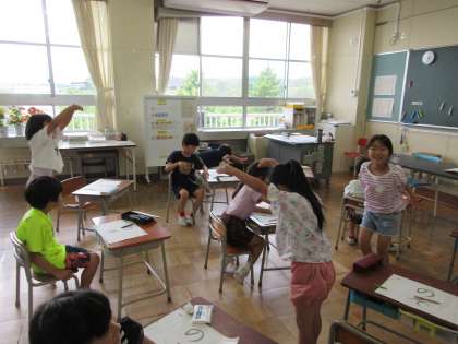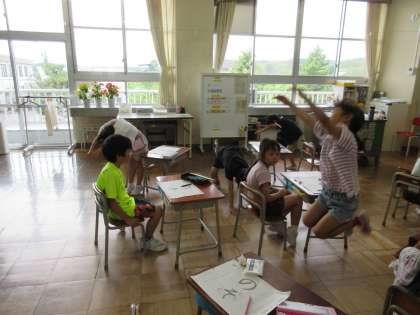 「曲がり」や「おれ」のひらがなを練習します。大切なポイントを体で表現していました。