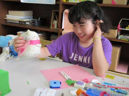 大切なぬいぐるみの服をつくりました。完成の喜びが素敵な表情に表れていました。