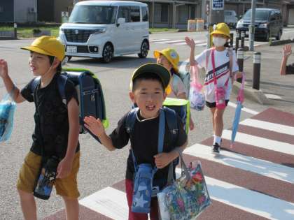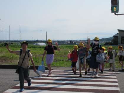 今日は、下学年、上学年に分かれて、古沢小学校に出かけます。プールセットをもった子供たちはとてもうれしそうです。