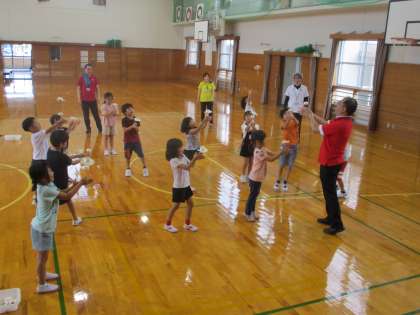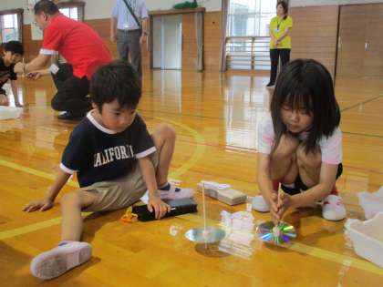1・2年生は、まわして遊ぶことができる「こま」や「紙コップター」を楽しみました。