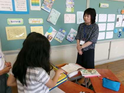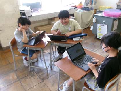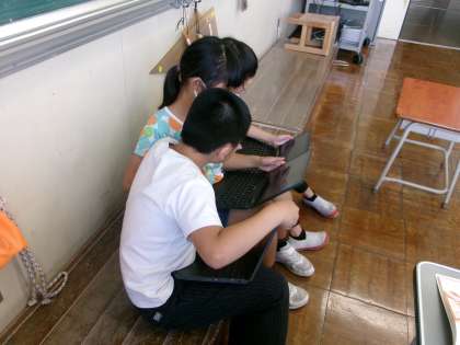 「新聞を作ろう」の学習をしています。インターネットで調べるグループ、アンケート作りをしているグループ、インタビューしているグループ、それぞれ新聞のテーマに沿って、取材をしています。校長先生にもインタビューしました。