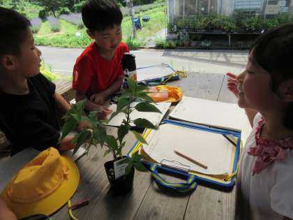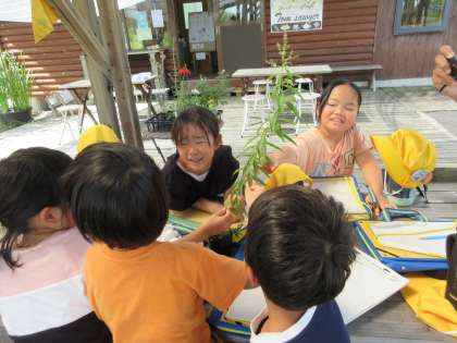 ハーブにはいろいろな種類があることを教わりました。実際に香りを確かめ、驚いた様子です。