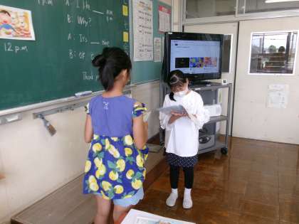 外国語活動では、「What time is it?」の学習をしています。今日は、自分の好きな時間と理由を尋ね合いました。