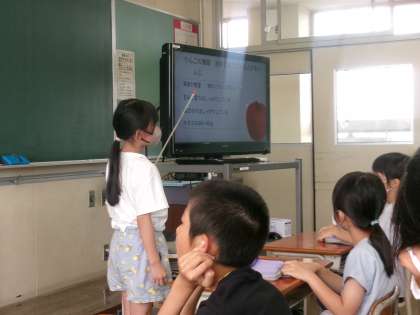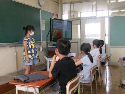 1学期に調べてきたことを発表しました。今日は、4年生が発表しました。スライドを使って、池多のすごいところをみんなに伝えました。