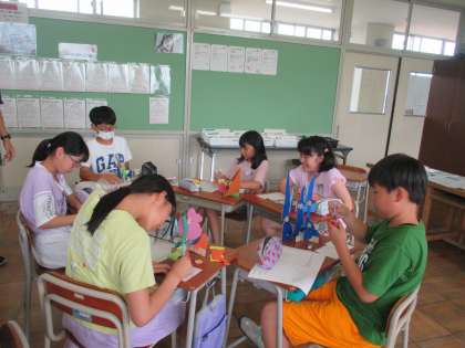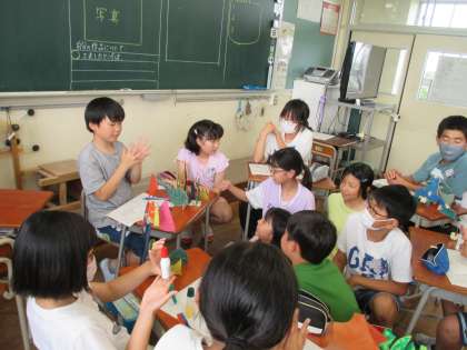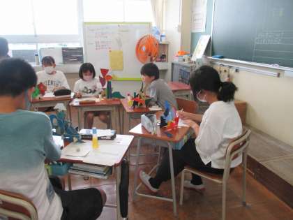 今日の図画工作では、「糸のこすいすい」で作った作品をグループで紹介し合って、友達の作品を鑑賞しました。その中で、友達の作品について感じたことをメッセージカードに書いて渡しました。