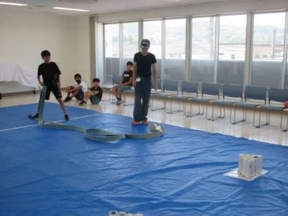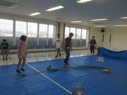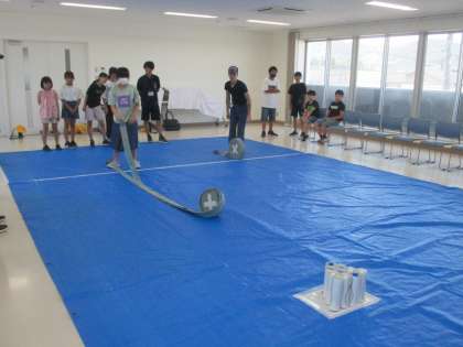ホースボウリングの体験をしました。実際に行ってみるとなかなか真っ直ぐにホースを転がすのが難しかったです。ピンに当てることができると喜んでいました。