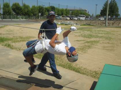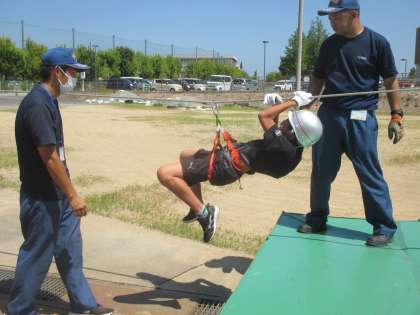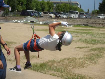 ロープ渡過体験をしました。ロープを渡るために用具を身につけて実際にロープを渡ることができました。