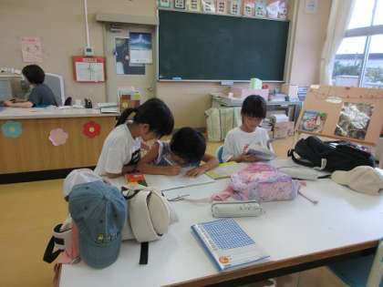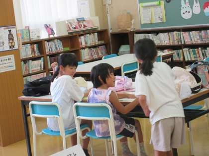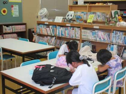 涼しい図書室では学習に励む子供たちの姿が見られます。午前も午後も子供たちが利用しています。