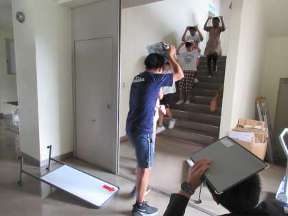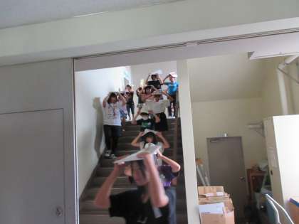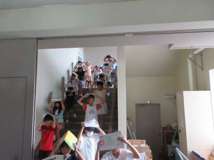 大地震を想定した訓練を行いました。落下物があることも想定し、真剣に体育館に向かっています。