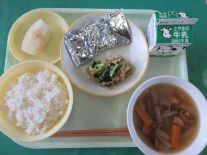今日のメニューは、ご飯、さばの銀紙焼き、はりはり和え、冬瓜スープ、梨、牛乳でした。秋の味覚、今が旬の梨が登場です。みんなうれしそうに頬張っています。