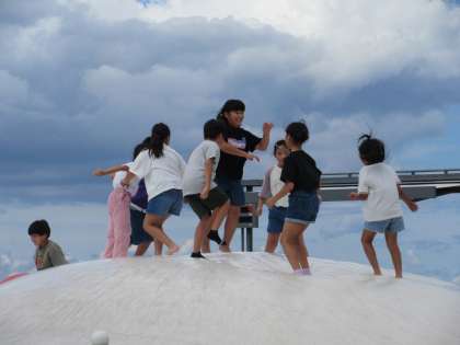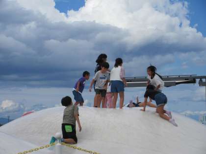屋上の広場では、学級みんなで思い切り楽しみました。まるで雲の上を跳んでいるような感じがしました。