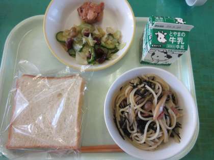 今日のメニューは、食パン、照り焼きチキン、ビーンズサラダ、ベーコンとひじきの和風スパゲッティー、牛乳でした。スパゲッティーはもちもちで、チキン、ビーンズサラダとともにとてもおいしかったです。