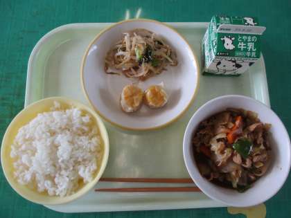 今日のメニューは、にんじんシューマイ、しおナムル、回鍋肉、ごはん、牛乳でした。こくのある回鍋肉とあっさりとしたしおナムルがおいしかったです。
