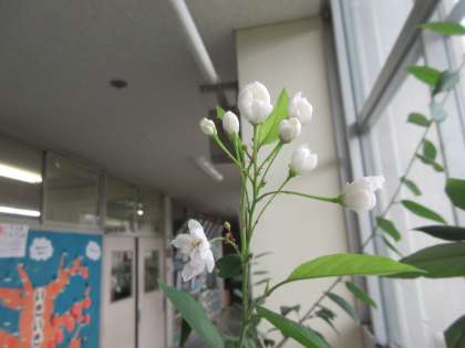 職員室前のハナカイドウも白い花を咲かせています。小さくてかわいいお花です。