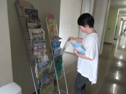 玄関の一角に、様々な催し物のお知らせが置かれています。順次、新しいものに交換しています。ぜひ興味のあるお知らせを見てくださいね。