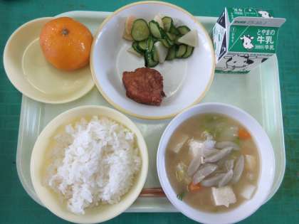 今日のメニューは、ご飯、豚肉の竜田揚げ、かぶの彩り、呉汁、冷凍みかん、牛乳でした。呉汁は、ごぼうのささがきのいい香りとともに白菜等のシャキシャキ感で、とても味わい深いおいしさでした。