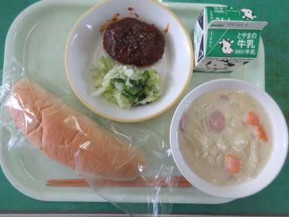 今日のメニューは、コッペパン、ハンバーグのケチャップ煮、アスパラサラダ、ホワイトシチュー、牛乳でした。ハンバーグはふわっと柔らかく、やさしい味のシチューとともに大人気でした。
