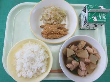 今日のメニューは、ご飯、きびなごのさくさく揚げ、甘酢和え、大根と鶏肉の中華煮、牛乳でした。さくさく揚げはからっと揚げてあり、どんどん食べたくなる食感でした。中華味の煮物もとてもおいしかったです。