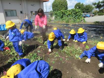 秋晴れの下、地域の方にこつを教えていただきながら、さつまいもを掘りました。
