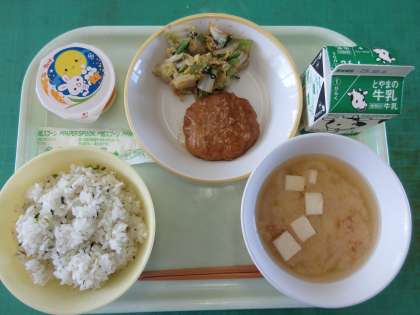 今日のメニューは、菜めし、鶏つくねのあんかけ、おひたし、白玉汁、お月見ゼリー、牛乳でした。中秋の名月にぴったりのお月見献立でした。