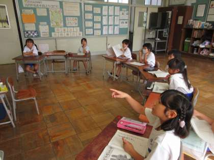 学習発表会のお話をみんなで確認しています。どんな劇になるか、今からわくわくします。