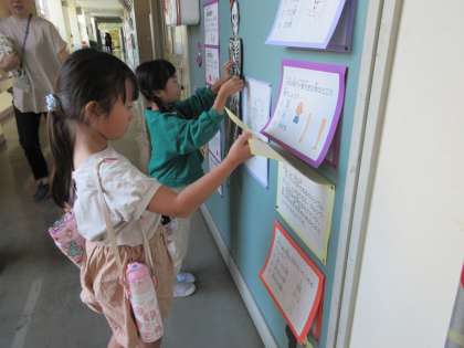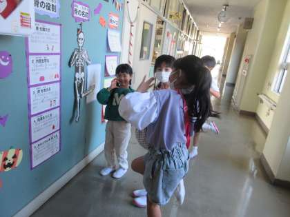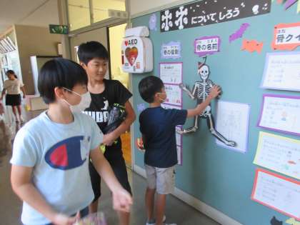 子供たちは、骨を動かしてポーズをとったり、クイズを解いたりして、立ち止まっています。