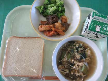 今日のメニューは、食パン、鶏肉とレバーのマーマレードソースがらめ、ゆでブロッコリー、卵ともずくのスープ、牛乳でした。甘いマーマレードのおかげで、レバーが苦手な人も食べやすく工夫されています。また、スープはとろっとして、おいしかったです。