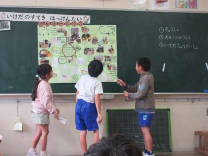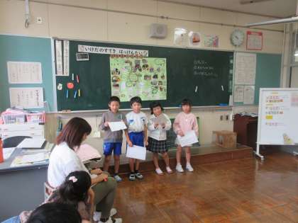 グループごとにまとめたことを発表しています。「池多のことがもっとすきになった」という感想が聞かれました。