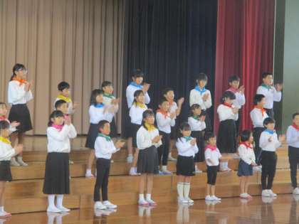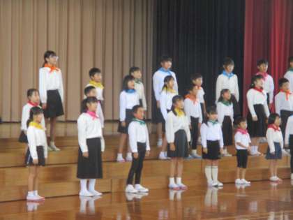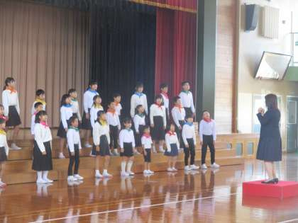 先生と心をつなぎ、笑顔いっぱいでうたいます。