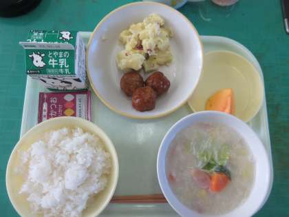今日のメニューは、ご飯、ミートボール、チーズおさつ、豆乳野菜スープ、柿、しそかつおふりかけ、牛乳でした。スープは具だくさんで、豆乳の味がとてもやさしかったです。