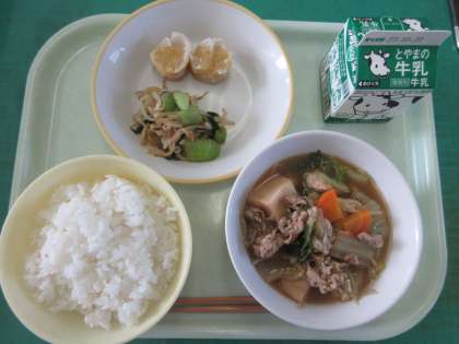 今日のメニューは、ご飯、にんじんシューマイ、もやしのおひたし、すき焼き、牛乳でした。ボリュームたっぷりなすき焼きは、よく味がしみていてとてもおいしかったです。