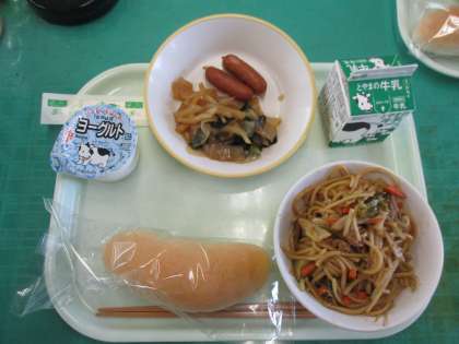 今日のメニューは、コッペパン、焼きそば、粗挽きウインナー、こんにゃくサラダ、牛乳でした。ボリュームたっぷりの焼きそばは、ソースがこうばしくてとてもおいしかったです。