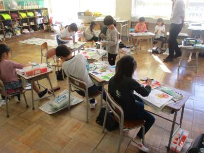 水彩道具を正しく使って、絵の具のぬり方を練習しています。