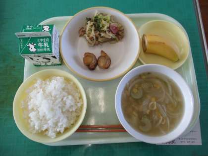 今日のメニューは、ご飯、ホタテのバター醤油焼き、切り干し大根のペペロンチーノ、マカロニスープ、バナナ、牛乳でした。マカロニスープは温かくて食べごたえがあっておいしかったです。