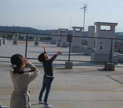 みんなで手をつないで「天までとどけ、1、2、3!」とジャンプしました。とってもきもちのよい青空でくじらぐもを見つけることができた子供たち。「おーーーい!」とみんなで叫び、楽しみました。