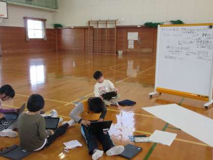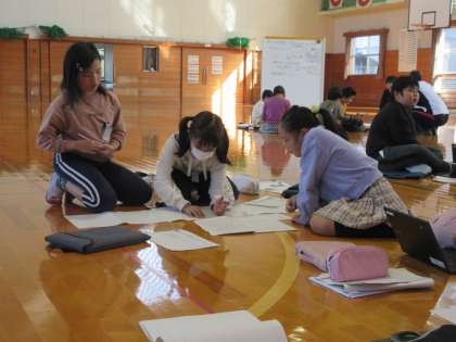 体育館では、グループごとに学んだことを整理したり、年表に書き込んだりして活動に没頭していました。