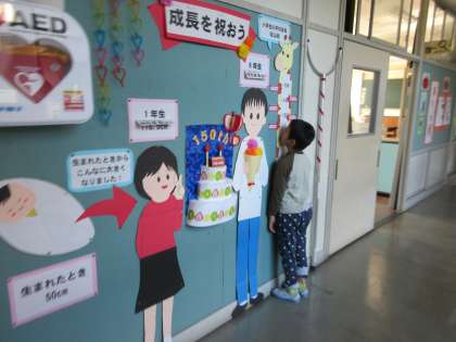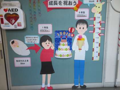 掲示が新しいものに張り替えられました。早速、身長を測っています。