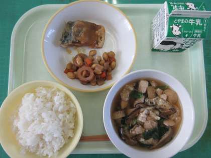 今日のメニューは、ご飯、魚の甘みそ和え、五目煮豆、うすくず汁、牛乳でした。甘みそがしっとりといい味で、ご飯もより一層おいしく感じました。