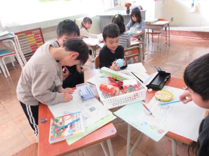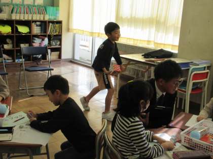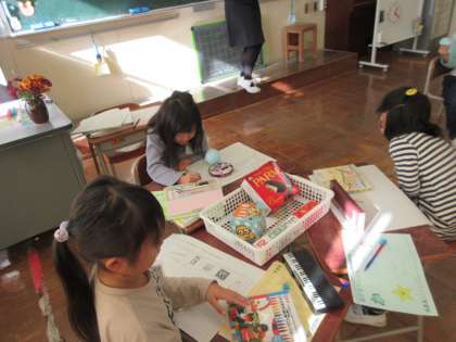 1年生は、かたちマスターを目指しています。形の特徴を触ったり、動かしたりして確かめています。
