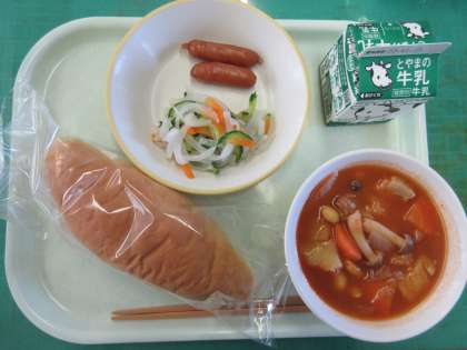 今日のメニューは、コッペパン、あらびきウインナー、大根サラダ、ポークビーンズ、牛乳でした。色鮮やかな大根サラダにじっくり煮込んであるポークビーンズは、パンとも相性がぴったりでした。