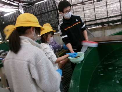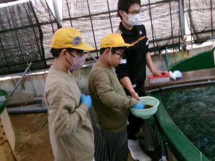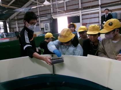 水産研究所では、養殖の様子を見させてもらいました。えさやりの体験もすることができました。