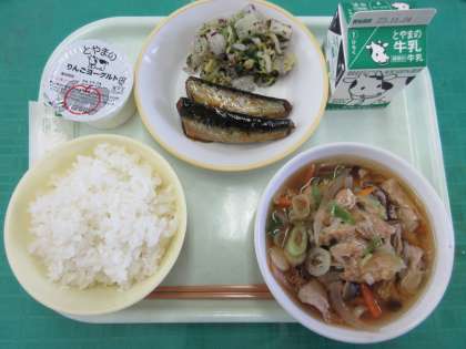 今日のメニューは、いわしの生姜味、ゆかり和え、五目うどん、牛乳でした。うどんの上には野菜や肉の具がたっぷり。体が温まりました。また、しゃきしゃきしたゆかり和えが魚と相性ぴったりでした。