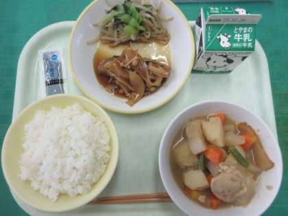今日のメニューは、ご飯、魚の黒酢あん、もやしのおひたし、関東炊き、牛乳でした。魚の香ばしさとたっぷりの野菜あんがからんで、より一層おいしく感じられました。関東炊きも、味がしみ込んで元気がでます。