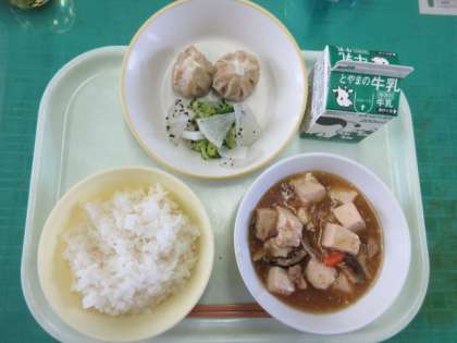 今日のメニューは、有機米、ショウロンポウ、大根とブロッコリーのえごまサラダ、豆腐ときのこのあんかけ煮、牛乳でした。えごまの風味が豊かで、とても香ばししかったです。