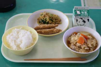 今日の献立は、きびなごの唐揚げ、納豆和え、親子煮、ごはん、牛乳でした。きびなごの唐揚げはさくさくと歯ごたえがよく、ふっくらとあたたかくておいしかったです。