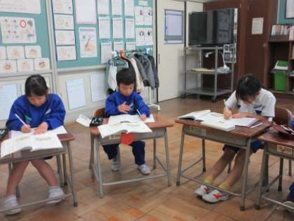 ものの名前について学んでいました。先生のお話をよく聞いて、ノートに名前を書いています。
