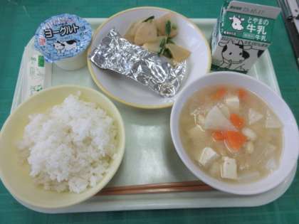 今日のメニューは、ご飯、さばの銀紙焼き、かぶの彩り、打ち豆汁、ヨーグルト、牛乳でした。豆も豆腐も入った豪華な味噌汁等、和食のおいしさを味わうことができました。