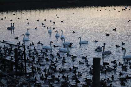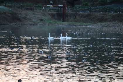 今朝の田尻池もたくさんの鳥たちでにぎわっています。白鳥は40羽ほど確認できました。コハクチョウも3羽見られました。